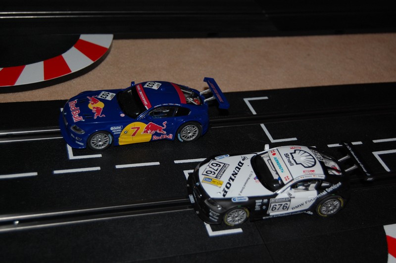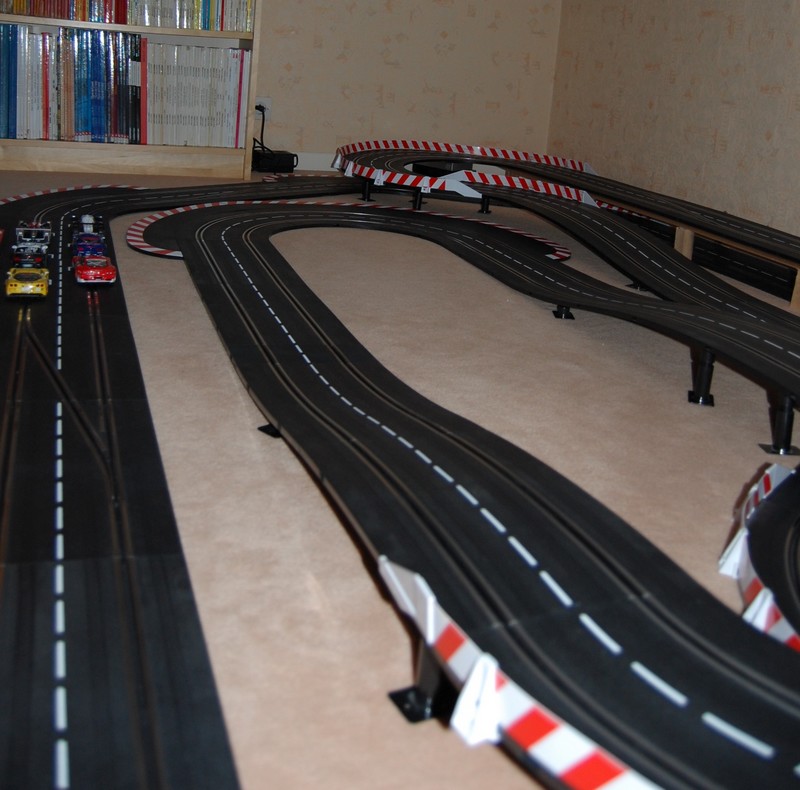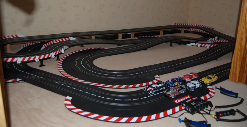 Voici mon circuit sur une surface de 3,33 m par 1,80 m. J'ai dû faire un étage. Le voici en photos : Avec mes 2 nouvelles voitures : 2 BMW Z4, comme cela, nous pouvons jouer à 4. Il me reste à digitaliser mes 2 gt mais je n'ai pas encore acheté des puces. (ça sera certainement avec le compte-tours |