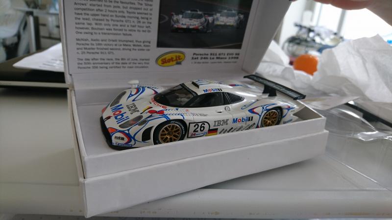 j'attends encore la Nissan 98 les Porsche de 87 et 88 la Toyota 88C de 88 justement et la Mazda 787B 1991 la Lola Aston Martin de 2009 et la Lola Greenwood. le tout de chez Slot It, mais c'est vraiment compliqué de commander, pas de dates de livraison, 3 endroits pour se fournir parce que personne n'a tout, et surtout parfois 30% de hausse de prix entre l'annonce au départ et le prix de vente à l'arrivée, pas moyens de payer avant, prix indicatifs, alors toujours possible de la refuser, elle part en vitrine et histoire terminée.