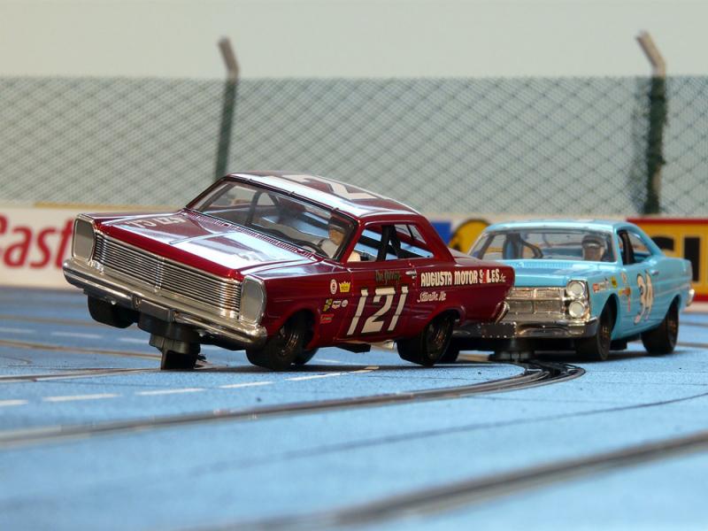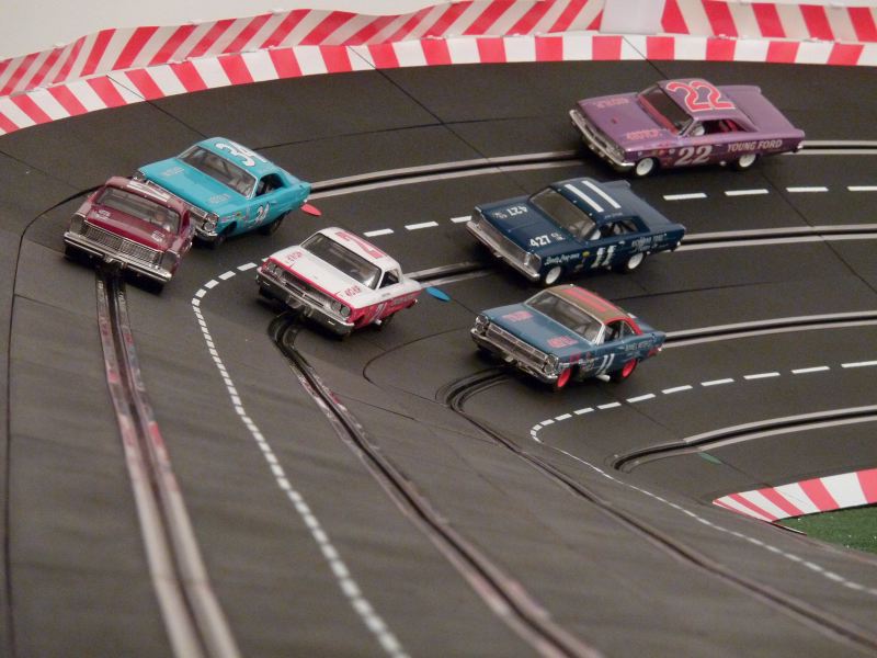 Nous roulons principalement avec du 1/32 (cartrix, Pioneer mustang, Fly classic stock ou full -préparées,Ninco full full prorace et slot it) et quelques Carrera 1/24 mais surtout les BRM 1/24 (on aimerait que la piste soit un poil plus large !) et des nascars 1/24 à base de châssis H&R racing.