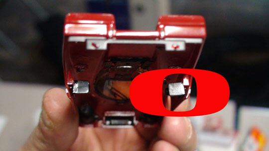 J'enlève l'aimant, je teste les réglages, j'essaye de comprendre pourquoi elle relève son nez, mais je ne vois rien d'évident. Alors je remonte la carrosserie et pour m'assurer de ce que j'ai cru voir, je place l'auto sur son socle de présentation, guide dans la fente. Bien vu GD, tout est de travers.