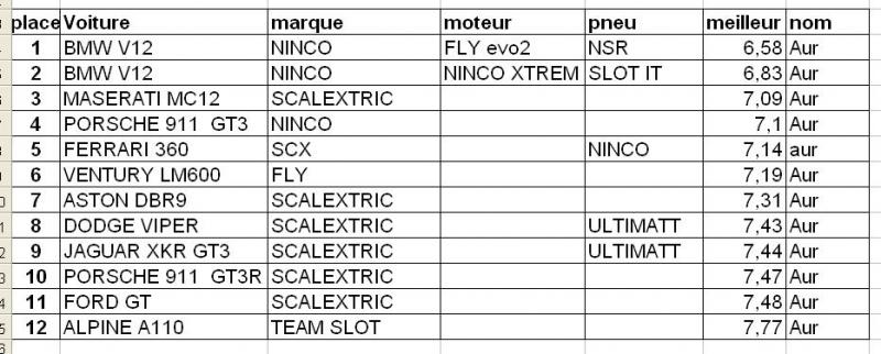 les resultats chaque voiture a effectué 10 tours afin de garde le meilleur temps: