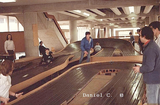 Un peu hors sujet en effet mais tant pis.. J'ai passé positivement des journées devant cette magnifique boutique, aussi bien achalandée à l'époque que les pistes américaines, en fait je ne l'avais jamais vue en photo, sur la seconde colone de vitrine se touvaient les incroyables roues de Drag Dynamic qui ont été à l'origine de ma vocation. La photo de la piste "Grand Prix" qui était la plus longue piste de production au monde à l'époque à du être prise pendant les 24h car elle est entourée de barrières, je pourrais être dessus, peut-être le ramasseur tout à droite avec le pantalon noir, mais on a tout un peu changé en 40 ans! Les hasards de la vie m'ont fait recroiser cette piste, elle a été démontée à la fermeture du centre, pas très bien stockée (les aglos de l'époque n'étaient pas les médiums d'aujourd'hui), puis Didier Moret du club de Créteil l'a installée à l'ecole Centrale ou il était étudiant vers 85 ou on a fait quelques courses, puis encore démontée et détruite faute de stockage. |