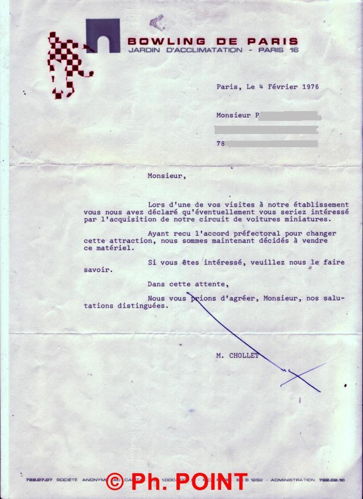 Mais ça je ne le découvrirai que bien plus tard. La dernière piste de la région parisienne à disparaitre fut celle du Jardin d'Acclimatation au Bois de Boulogne. Celle-ci a du s’arrêter vers 75, j'ai encore un courrier de 76 me demandant si j'étais toujours intéressé par son rachat. C'était une Royal AMF identique à celle de Bordeaux.