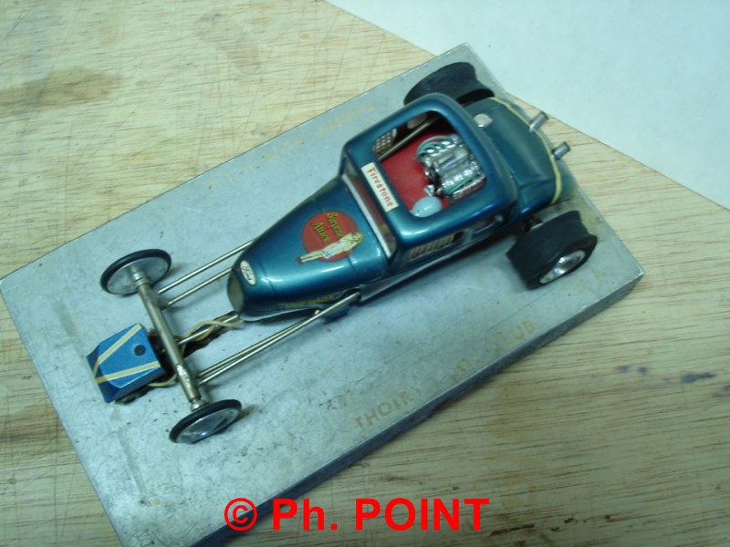 Le chassis est un K&B, la coque thermo en acétate de la même marque représente une Ford 32, moteur Pittman 5 pôles.
