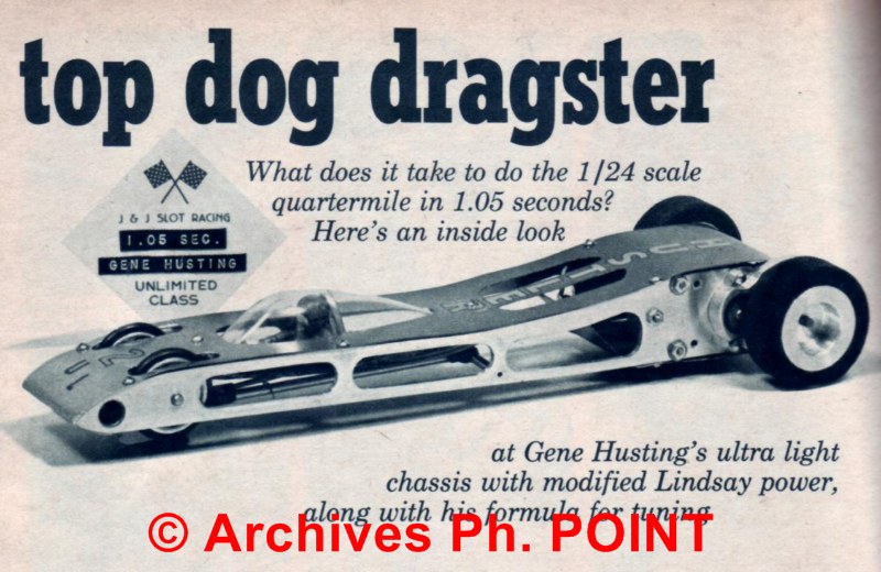 En effet Gene Husting était un esprit complètement novateur, dont l'influence sur le slot a été comparable à ce que Colin Chapman à apporté à la course automobile, en plus du Magwinder et des records de Drag, il a été le premier à faire fonctioner l'anglewinder sur des voitures de slot de circuit (pas sur de la date), un concept qui est toujours d'actualité en-dehors des micro-moteurs à aimants Cobalt. |