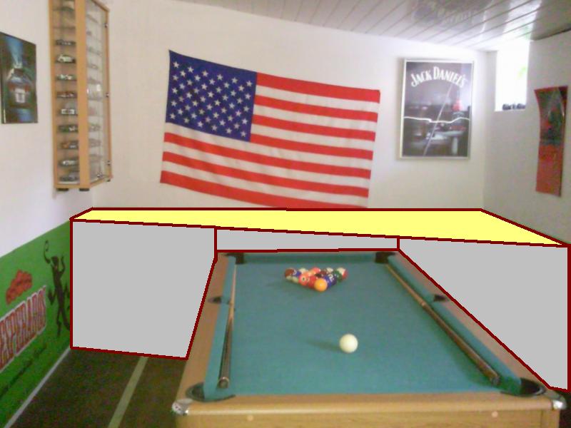 Avec ce système là, et sans déplacer la vitrine, je pourrais faire un plateau d'environ 3m50 de long (entre mon meuble et ma vitrine), sur 1m50 de large (grosso modo le billard est à 80cm de haut, et j'ai 2m50 de hauteur sous plafond à cet endroit).