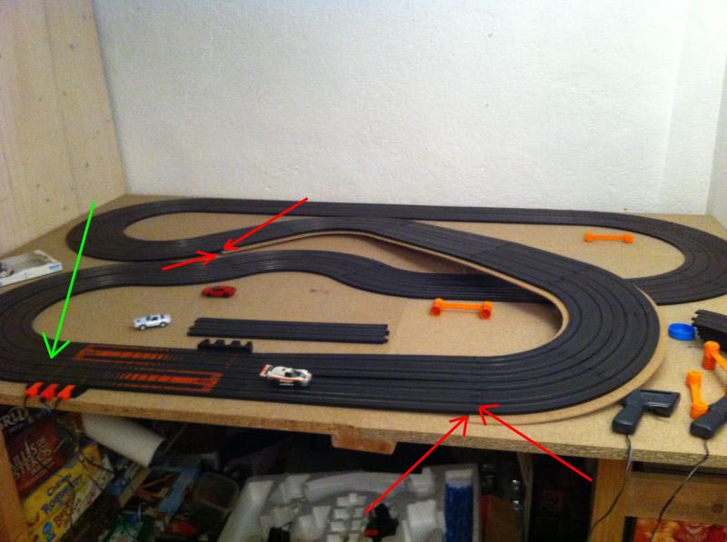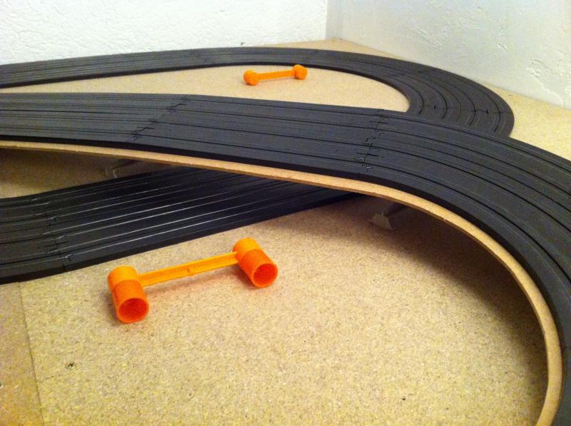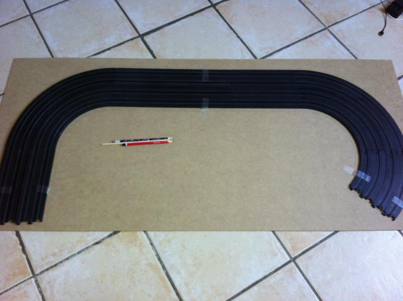 Je viens de recevoir les 6 rails manquant et la Ford GT 40 MK II. Je vais donc m'atteler à monter le circuit. Dans le tracé plus haut il faut question les voies passent dessus les arts. Il va donc falloir fabriquer un chemin en contre plaqué qui respectera une pente douce afin de ne pas créer de micro coupures dans l'alimentation. Ce qu'actuellement j'ai quand je bricole le circuit.