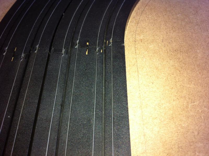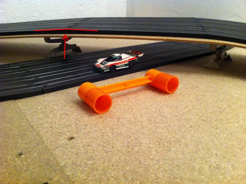 Attention aux "cassures" aux jonctions des rails, on voit bien sur les 2 photos du bas que les jonctions ne sont pas planes, ça peut soulever légèrement la voiture et plus de contact. A mon avis c'est préférable de fixer les rails, surtout quand il y a une surélévation comme tu l'a fait. Contrôle aussi le bon débattement verticale des patins sur les châssis.