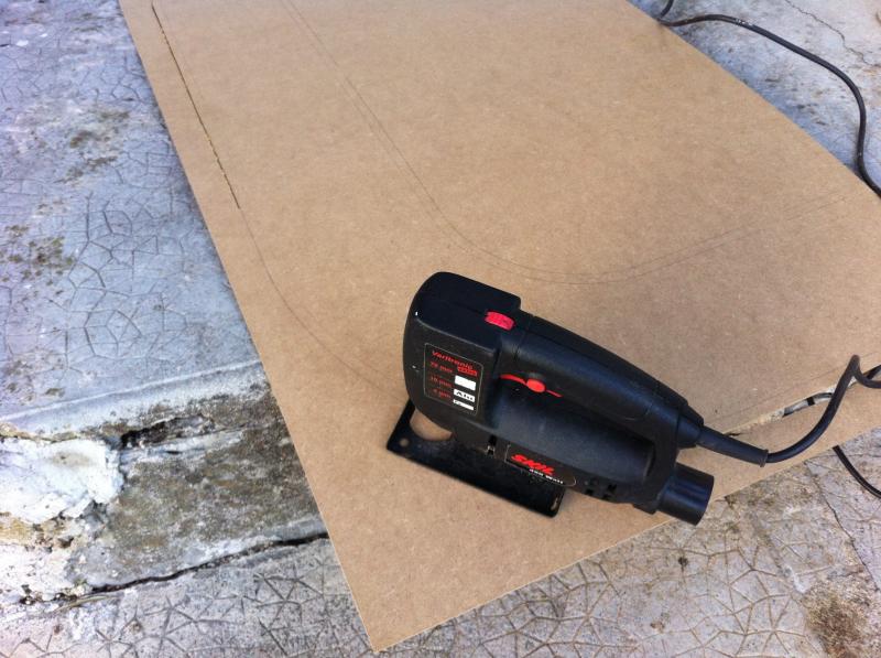 Alors j'ai donc découpé une plaque d'agglo pour positionner les rails qui passeront dessus comme on peut le voir sur la photo. J'ai tracé en laissant de la marge autour... un cm. Puis j'ai découpé à la scie sauteuse J'ai ensuite mis en place du circuit.