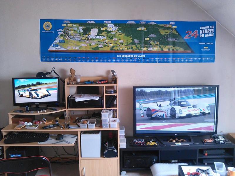 Vue depuis le canapé, l'écran de gauche pour le live texte, la TV pour le direct eurosport, le pc pour les chronos Et la liste des équipages pour rayer les voitures hors courses. La biere est au frais, il reste a préparer les hors d'oeuvres pour tenir 24h. |