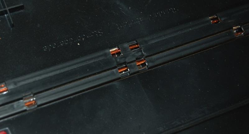 Et j'ai commencé la partie électrique avec "l'enfilage" de fil de cuivre dénudé de 1,5 dans l'ensemble des conducteurs de la piste. Les sections ainsi "enfilées" seront pontées entre elles et je terminerai le tout par 4-5 points de repiquage de jus. Une image déjà de "l'enfilage" :