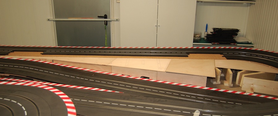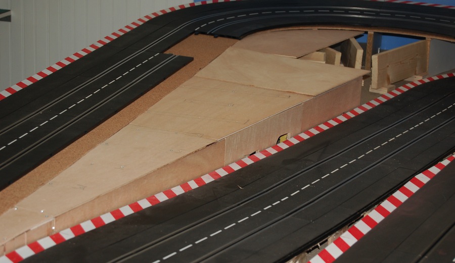 Et la partie des stands qui est surélevée par rapport au plateau, mais qui est en fait le niveau "0". Vous verrez ainsi que la piste qui passe sous le banking est en fait un tunnel (le banking n'est pas un pont, il est au niveau 0) :