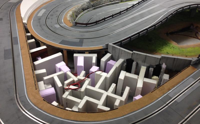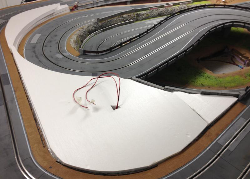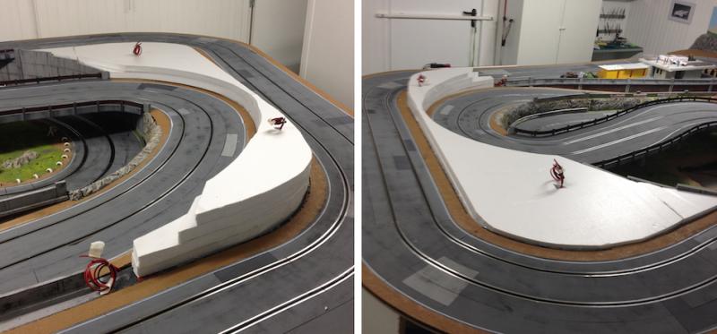Sinon, un peu de temps ce soir pour attaquer la suite avec les reliefs des virages haut et bas de la partie droite du plateau. Donc utilisation de chutes de polystyrène pour la structure légère et plaques pour recouvrir. Le tout collé ... y a plus qu'à sculpter. (enfin encore un peu de polystyrène à rajouter à certains endroits). En images :