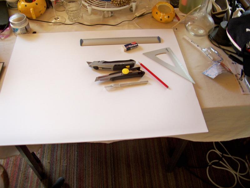 Bonjour à tous, après une petite pause je vais commencer la découpe du carton plume pour les stands grâce au plan éclaté de Sergio je me suis fait un plan de travail dédié sur une table dans l'appartement, fallait que je range pour cela et ça m'a pris du temps