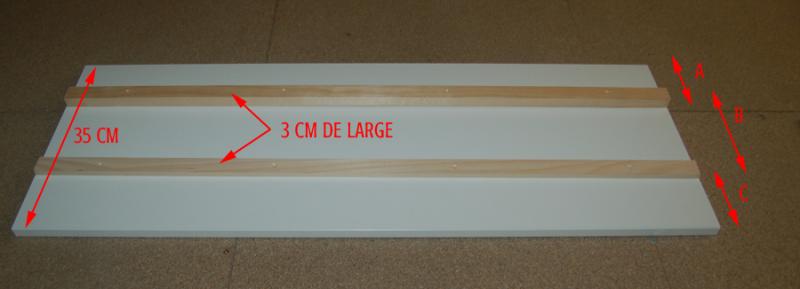 | JohnSmith a écrit : Qu'en pensez-vous ? A vu de nez A=6à8cm, B=14à16cm et C=11à13cm. Mais le mieux c'est de tester avec le plus grand nombre de tes voitures pour voir si ça te plait ! Tu vas les peindre en blanc tes baquettes ? |