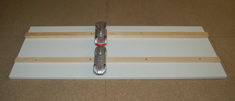 C'est du PVC expansé de 3mm, pliée vec une thermoplieuse... Temsp de réalisation, 2mn par plaque, 6 voitures par plaque et 2 trous pour les vis de fixation... Avec des cales, pas besoin de fente pour le guide et les pneus ne toucheront pas, mais pas trop surélevée, juste ce qu'il faut, je vais faire des essais au niveau de l'épaisseur de la cale...