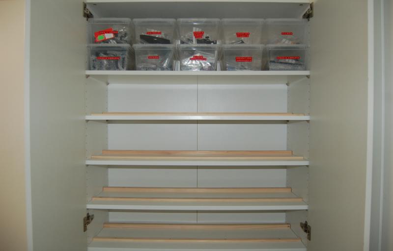 Et les premières tablette dans l'armoire ainsi que la tablette du haut avec ses 10 bacs pvc qui rentrent pile poil :