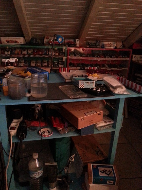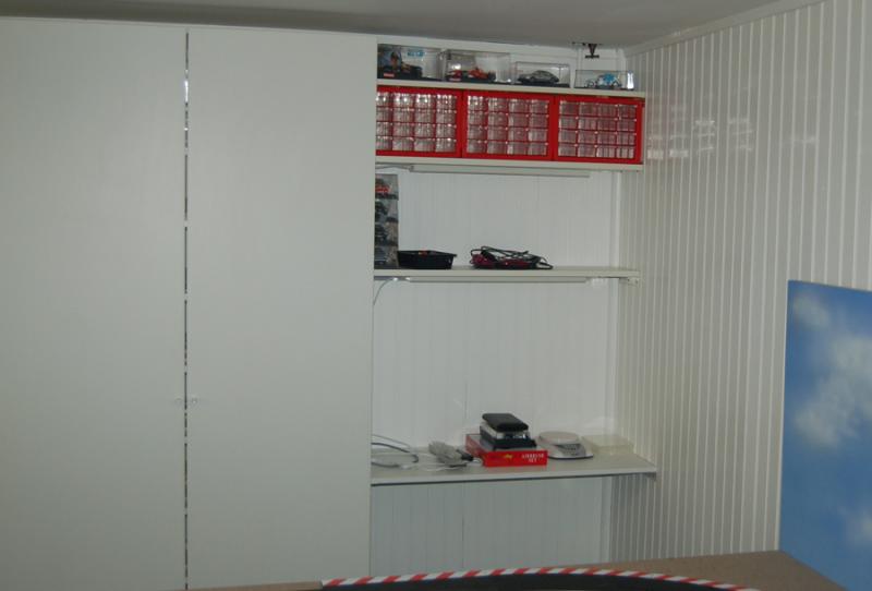 Et pour terminer, l'espace "bricolage" en bord de piste entre le mur et la 3ème armoire. De haut en bas, les 3 box pour les petites pièces qui s'encastrent parfaitement dans la largeur, ensuite l'étagère qui accueillera la section de piste d'essai / rodage moteur - pneus ... avec différents voltages et pour finir le petit établi pour bricoler (j'ai un petit tabouret, pas visible sur la photo). Et petit luxe, sous chaque étagère est placée une réglette de néons afin d'éclairer parfaitement la piste d'essai et l'établi. Ce dernier sera recouvert d'un sous main "millimétré" de type auto-cicatrisant pour plus de durabilité et d'un bloc de 3 prises (fer a souder, colle chaude, ...). En image, même si c'est pas terminé :