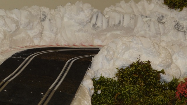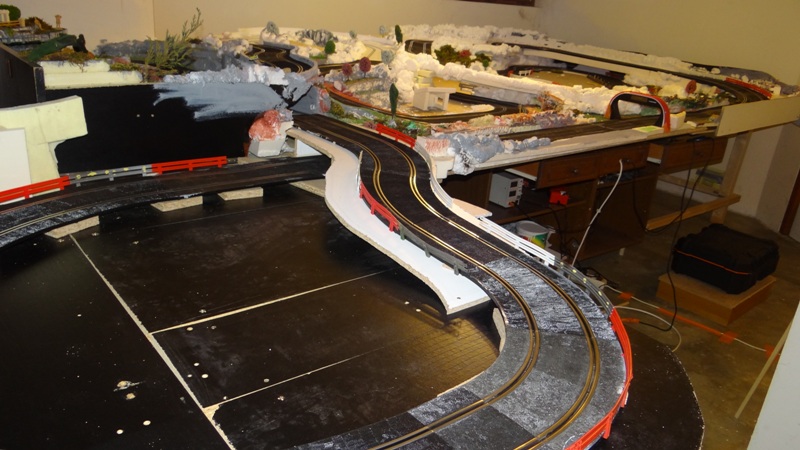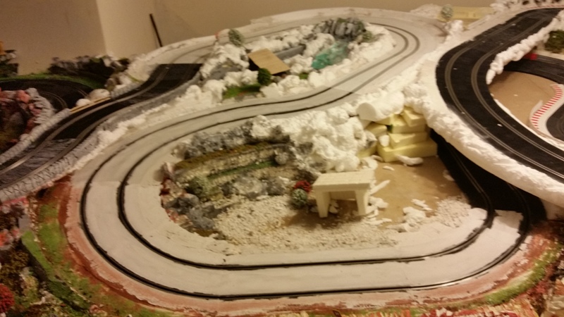 Pour la partie neige je ne trouve pas réaliste cette jonction seche avec la partie noire alors j'y travaille. Du plâtre sur la piste, ponçage, colle blanche... le grippe est proche de celui d'origine, je vais voir pour faire un effet boue neige.... en diminuant un peu le grip