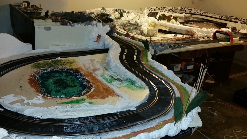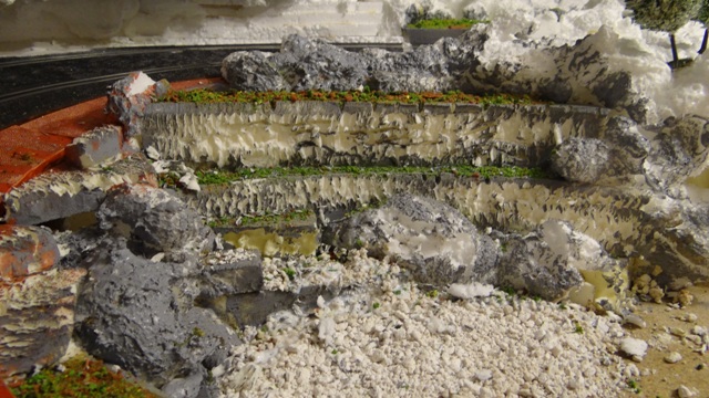 Au départ je pensais que tu laissais la mousses blanches pour simuler la neige. Mais je vois que tu as peint en gris à certains endroits. Tu as également laissé la mousse expansive en boule, c'est pas si chouette comme ca. Mieux vaut faire des rochers. Tu les peints et si tu veux un effet neige, tu floques.