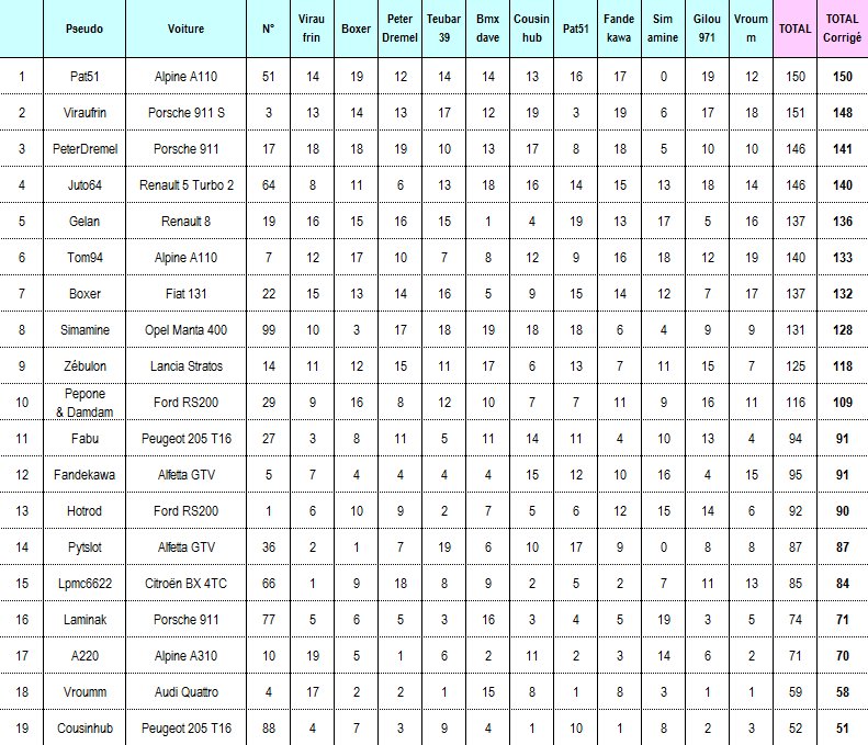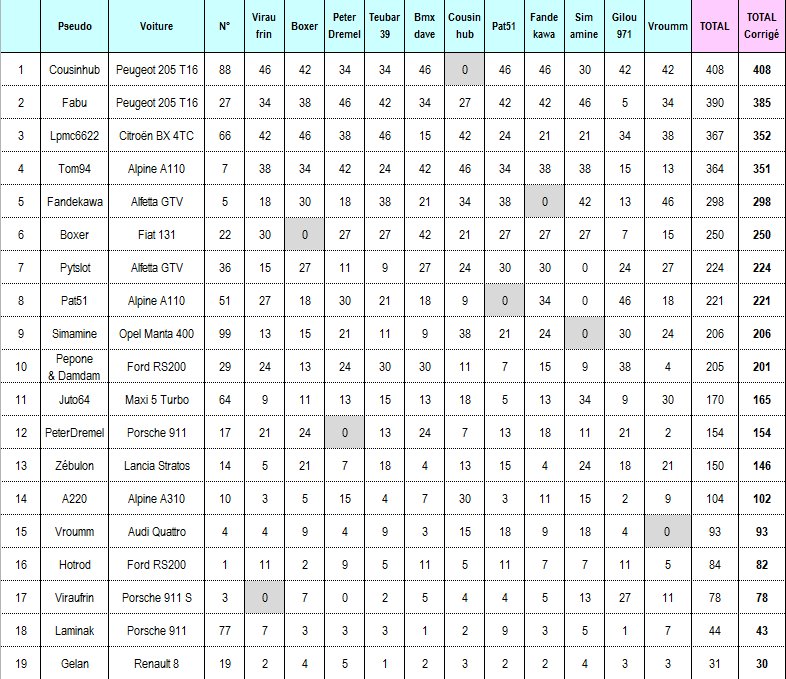 Juste un bémol : la contre-performance de la voiture de Fabu est heureusement limitée par le fait que le plus mauvais résultat n'est pas pris en compte.