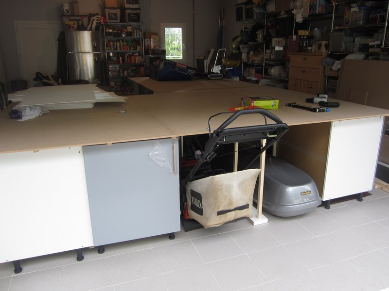 Dessous ( et sensiblement de même dimension que le plateau ... ) y'a le châssis bois et les meubles ... J'ai juste pu arrondir les angles !