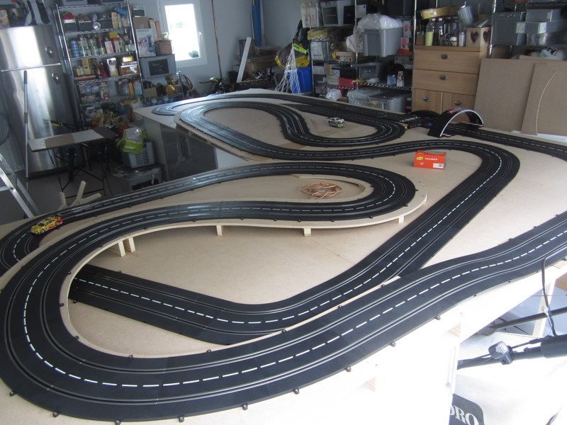 Le temps que je réfléchisse à l'après plateau ( Bordures / Décos / etc ... ), et pour que je puisse essayer la piste avant de finaliser l'ensemble, sans voir mes bolides tomber par terre à chaque sortie de route