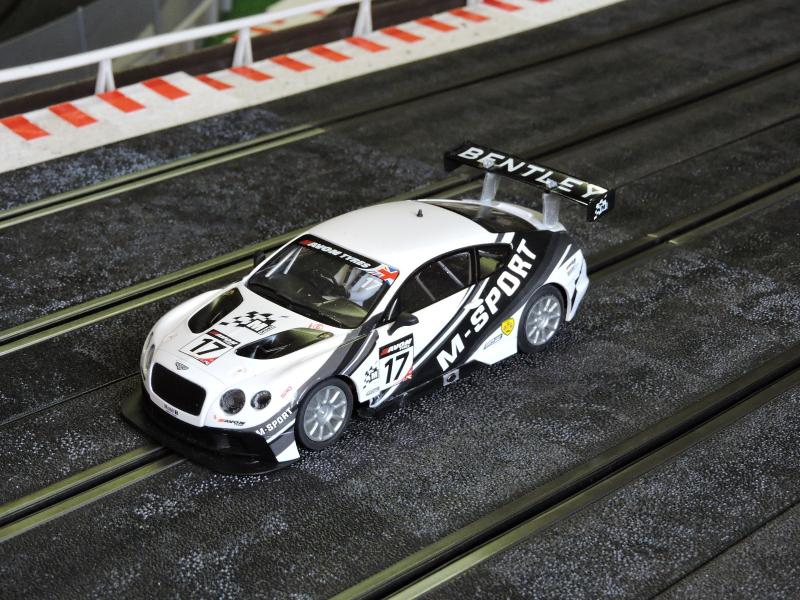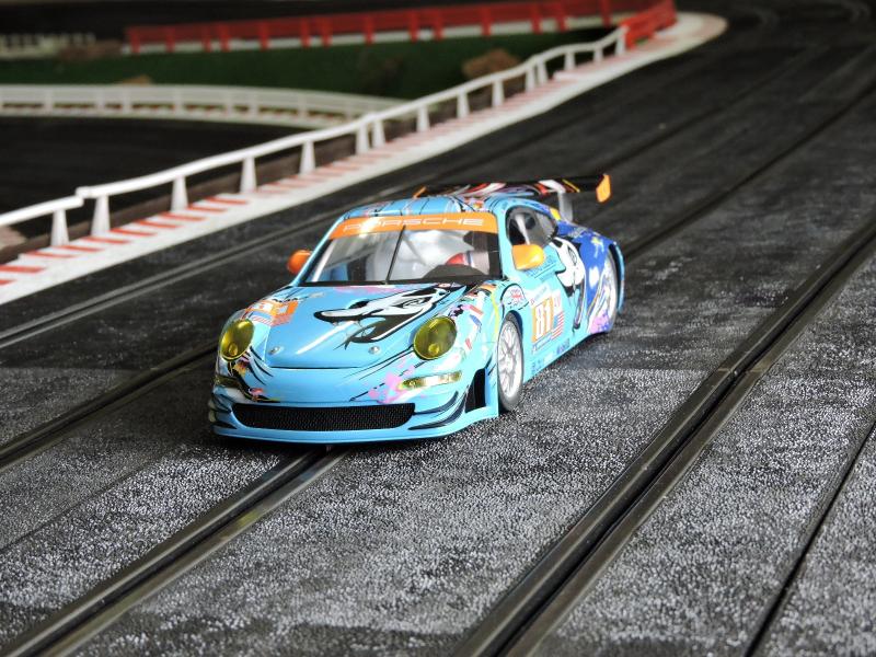 Porsche 911 GT3 Scaleauto au 1/24 e , c'est assez encombrant sur du Ninco mais ça passe, interpiste 9 cm , voiture 8.3 cm, il n'y à pas trop de marge, mais bon, c'est pour essayer et bien ça marche plutot bien , plus vite qu'une BRM , c'est gros, lourd mais finalement très agréable