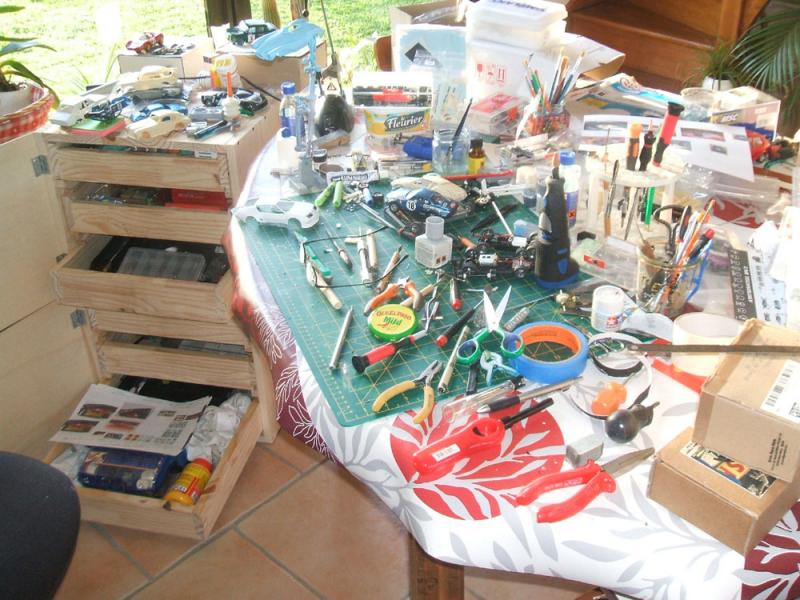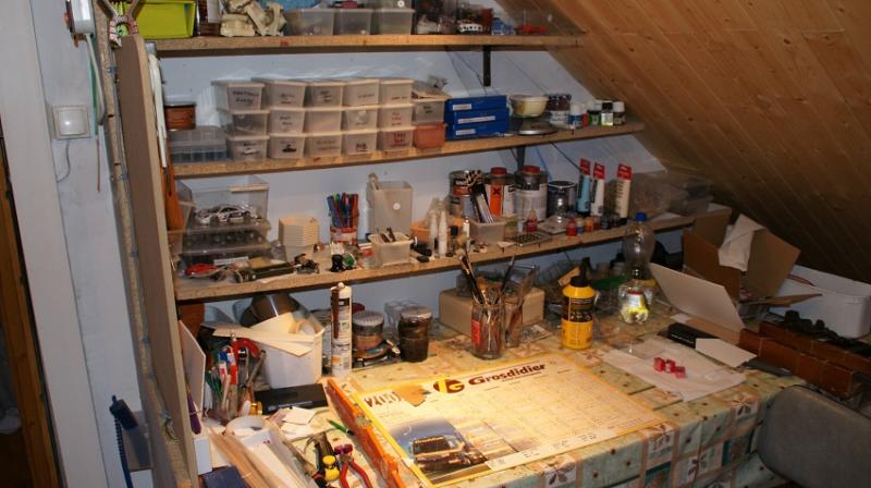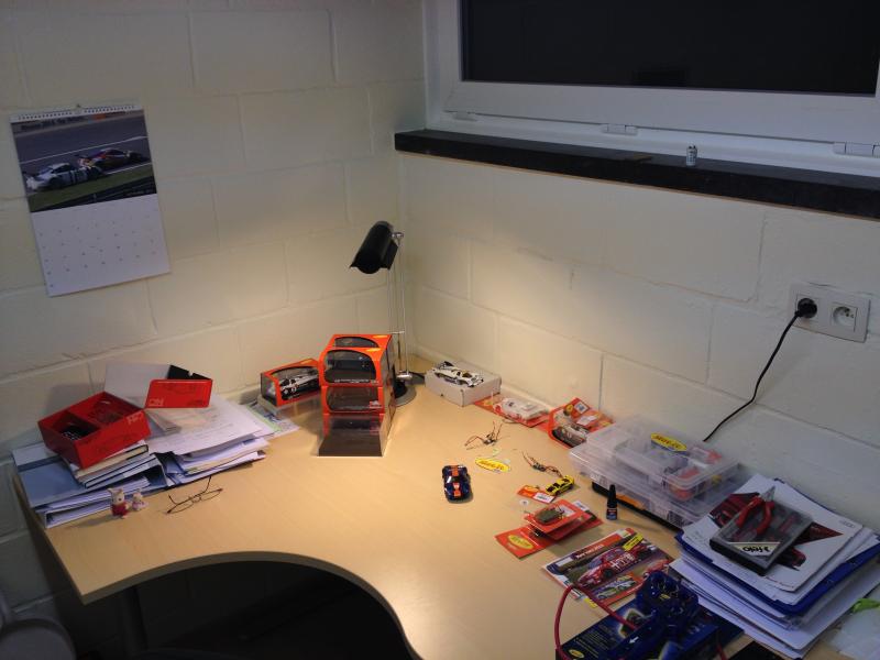 Alors voici une première photo de mon antre, tout près de ma slot-room. Pour le moment, je n'ai pas encore trop de matériel pour les voitures (pneus, puces, ...) et je n'ai pas encore besoin de beaucoup d'espaces de rangement. Mais quelque chose me dit que ...