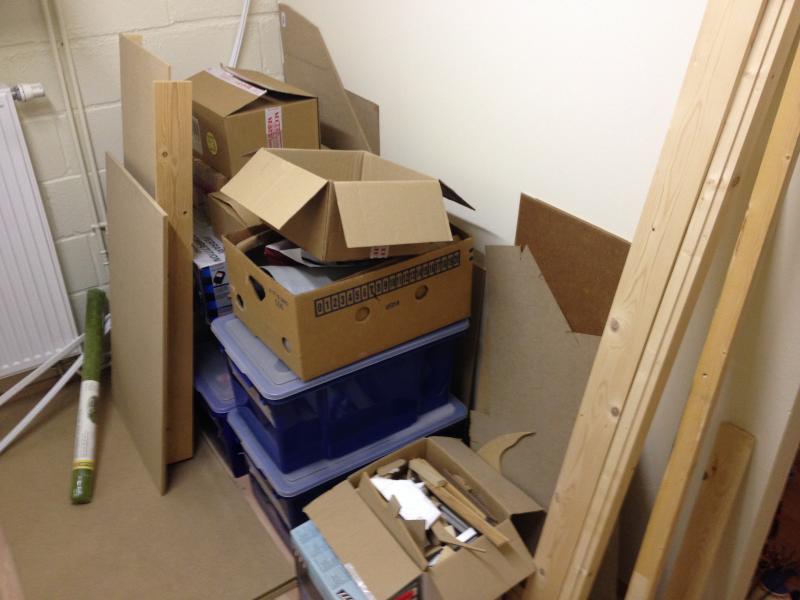 Ca vous paraît bien rangé? Rassurez-vous et regardez ce que donne l'angle opposé de la même pièce, où se trouve le matériel du futur "Autodromo dell'Acqua Rossa" (rails, bâtiments, accessoires, déco ...):