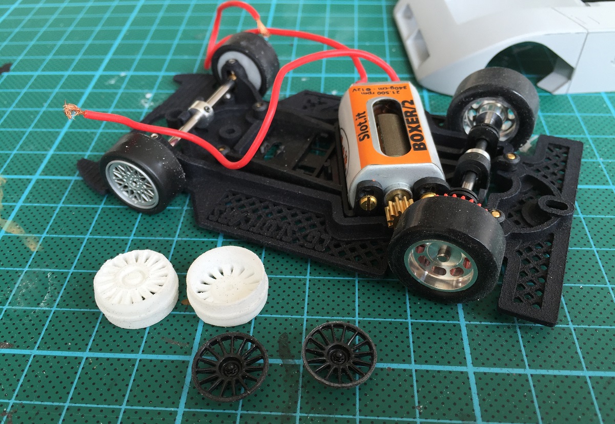 J’ai remplacé les roues avant fournies dans le kit par des roues Slot-it en plastique ! Pour la simple raison que les roues fournies étaient imprimées (avec des parois relativement épaisses) et que les inserts ne rentraient pas dedans