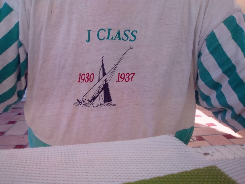 Par contre Pepe porte un tee-shirt estampillé Class J, la Classe "J" est une jauge exclusivement réservée à la coupe de l'América de l'entre deux guerres, qui vit la participation des plus beaux voiliers jamais construits. Seulement dix class J ont vu le jours, dont trois ont survécus à ce jours, les autres ont tous fait l'objet de refabrications récentes et disputent ensemble les épreuves de voiles classiques tel de les Voiles d'or de Cannes.