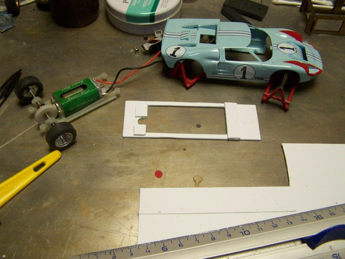 J avait fait châssis en plastique mais ça n allait pas c était un plastique blanc souple type profilé pour finition de fenêtres, et un autre en plexi mais trop cassant, apres c est plus confortable à travaillé que l alu et plus rapide à taille au dremel. Penses bien à faire ton train avant réglable en empattement, et bien repérer l emplacement ou ti vas mettre ton support moteur si tu fais comme moi à base de slot it . Si c est pour gt40 je conseil le side car inline ou en travers tu vas te faire chier avec l habitacle ma mustang c était pareil , pour ça que j ai changé en route . Le top pour ton traçage c est si jamais tu as un châssis adaptable slot it nu, tu suis les contours , je l ai fait une fois c était assez confortable . Les autres me suis demerde à coup d ajustement de dremel , d ailleurs tu devras limer quelques endroits car les châssis maison , les miens tout cas , n ont pas d épaisseur différentes pour les différentes fantaisies des supports slot it qui croissent un coup en haut un coup en bas sur les côtés. Apres quand ça roule ,c est très satisfaisant .