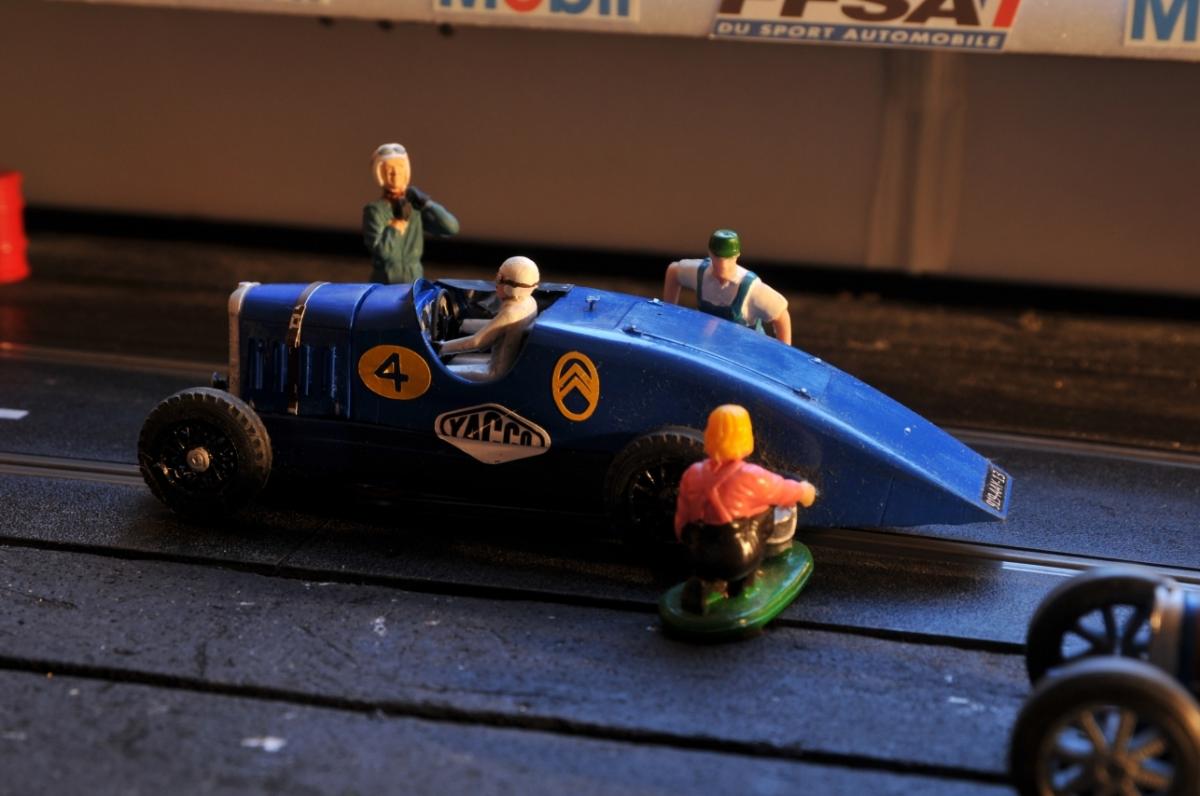 Whaouuu ! J'ai également un vieux Scalextric, avec une alimentation 0 - 24 volts (4 ampères) réglée en général sur 12 où 13 volts, ce qui permet de baisser la tension lorsque des enfants se servent du circuit, ou au contraire de passer à 14 volts avec quelques pilotes expérimentés... Tout ça pour dire que jeudi dernier encore, étant occupé l'après midi à l'atelier, j'ai réglé la tension et bloqué la poignée avec un élastique, de façon à faire tourner une de tes Bugatti pour occuper le lieu, et qui a "gentiment" effectuée ses 1250 tours à une moyenne de 12 secondes, sur un circuit de 15,5m... En un peu plus de 4 heures !!! Soit un peu plus de 19 kms