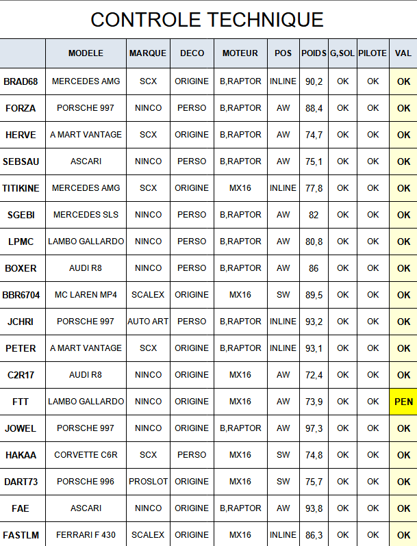Toutes les voitures ont bien passé le contrôle à l'exception de la Lambo de FTT qui présente une modification du châssis non autorisée dans le règlement ,,je présume que c'est du a une mauvaise lecture du règlement ( l'année précédente l'allègement du châssis était permis dans la mesure du raisonnable mais pas cette année ! ),,,il faut lire et relire le règlement avant de finaliser vos voitures