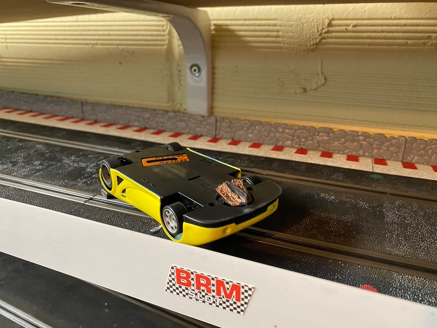 comme la voiture est longue et basse et qu'en plus il y a une espèce de bosse à l'endroit de la vis avant du berceau, je pense que sur certaines bosses de la piste, il n'est plus assez profond pour bien rester dans la fente