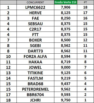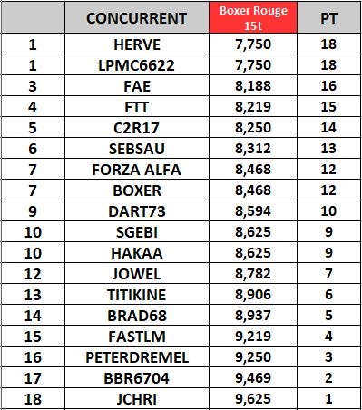 Bon je reste régulier, encore dernier... j'espère que vous allez vous y faire à cette Porche pour gagner au moins quelques points. Je sais que la voiture n'est pas large, mais quand même lol. Si je n'ai que des 1, cela va vraiment me décevoir...