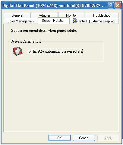 Fait un clic droit sur ton bureau, puis clic successivement sur Propriétés > Paramètres > Avancé. Tu as forcément un onglet qui contient l'option qui te permet d'effectuer la rotation de ton écran en mode "Paysage" ou "Portrait" par la droite ou par la gauche ou inversé. Soit l'onglet "Screen Rotation", soit dans l'onglet "Intel(R) Extreme Graphics"