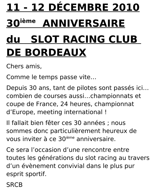 Ces pas tous les jours qu’un club de slot a 30 ans et s’est pour sa que le club de Bordeaux vous invite à venir fêter ses 30 ans le 11 et 12 décembre 2010 sur ces 2 pistes