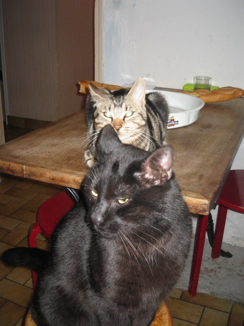 Il est vital d'éloigner ces dangereux animaux des poils de balais. Pour mignons et adorables qu'ils fussent (quioque, le noir, si on regarde bien, à un regard de tueur. Nan, en fait, c'est une crème... surtout quand il a la panse bien pleine. Là, elle était vide et il rigole moyen, l'estomac vide), ils se transforment en dangereux fauves hystériques quand ils découvrent les poils. J'en ai fait les frais, autant vous passer le tuyau:)