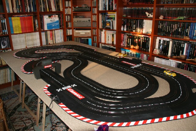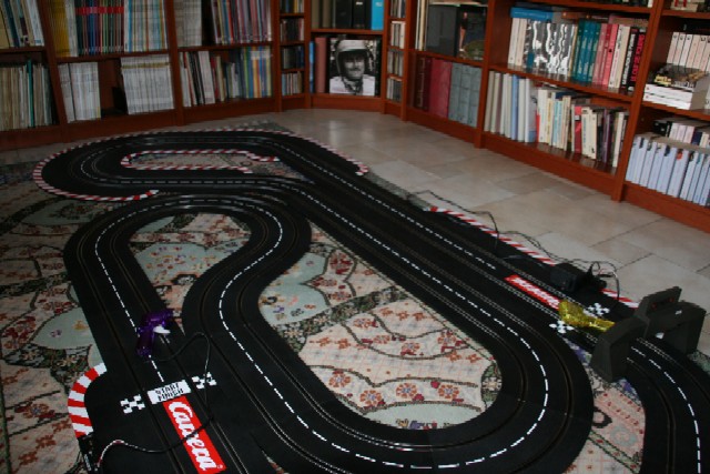 Après vous avoir sollicité pour un tracé dans la cave chez mes beaux-parents, j’ai décidé de rapatrier le matos chez moi (2 boites de Carrera), avec l’accord de madame, pour faire un circuit démontable, la pièce qui l’accueille étant la bibliothèque/chambre d’amis.