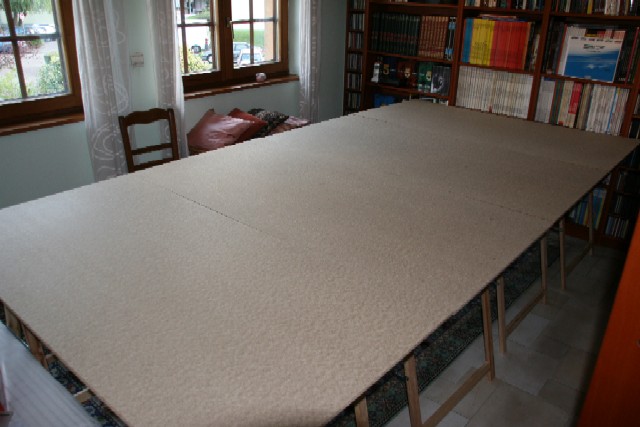 Pour l'instant, ça marche bien comme ça, même si l'accès de l'autre coté n'est pas facile, et qu'il n'est possible de tourner autour. Planche de 3m20 x 1m60 dans un espace de 3m60 par 2m20 (Tiens, ça me fait penser qu'il faudrait de je perde un peu de poids ).