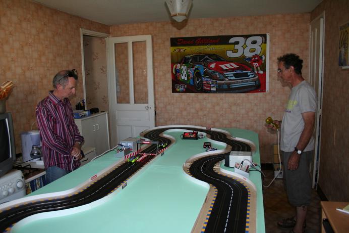 Une plaque d’alimentation de chaque coté avec un transfo par voie, chacun sa parma et pas de problème de ramassage car on se trouve chacun d’un coté du circuit. Le compte-tour Carrera acheté à lors d’un voyage à Barcelone il y deux semaines sert plus tôt que prévu.