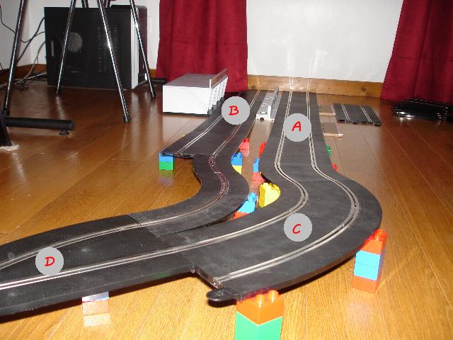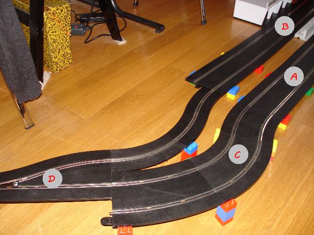 Je me suis inspiré du fameux raidillon pour ajouter sur ma piste un leger pif paf en cote , suivi de la sortie des stands. Je m'explique : le nouveau tracé