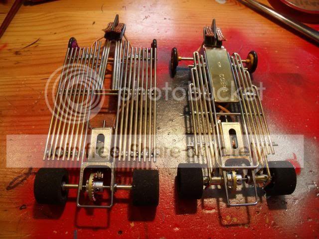 Exemple 2 châssis que j'ai utilisé vers 67. Ces 2 châssis de marque Mura sont identiques, seuls les côtés sont différents. Le train avant de celui de la boite est manquant :
