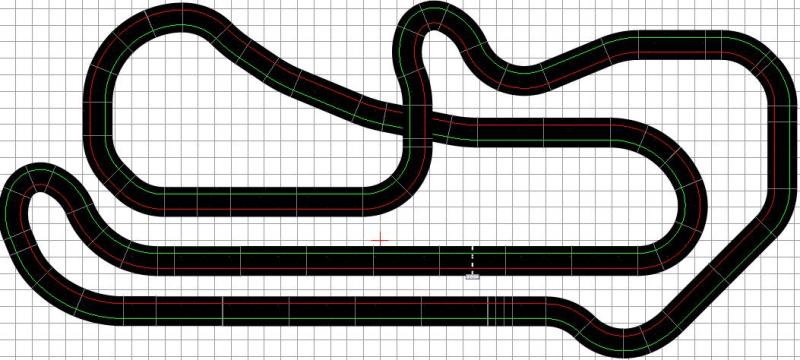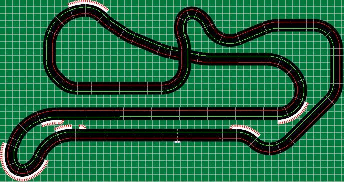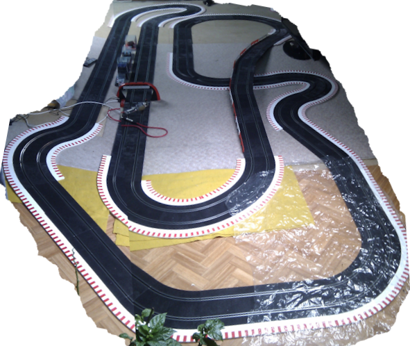 Son encombrement a diminué ce qui est toujours bon à prendre, il fait 4,73x2,47m sans les bordures pour un développement de 21,17m pour les 2 voies. Il me parait un peu plus fluide maintenant avec une ligne droite plus longue, ce qui fait 2 partie très rapides en pinaillant pas trop; j'ai testé ce semblant de grande courbe TRES large (ben quoi ya pas de R32) sur un autre tracé et on l'a adopté. Bref voici ce que ça donne