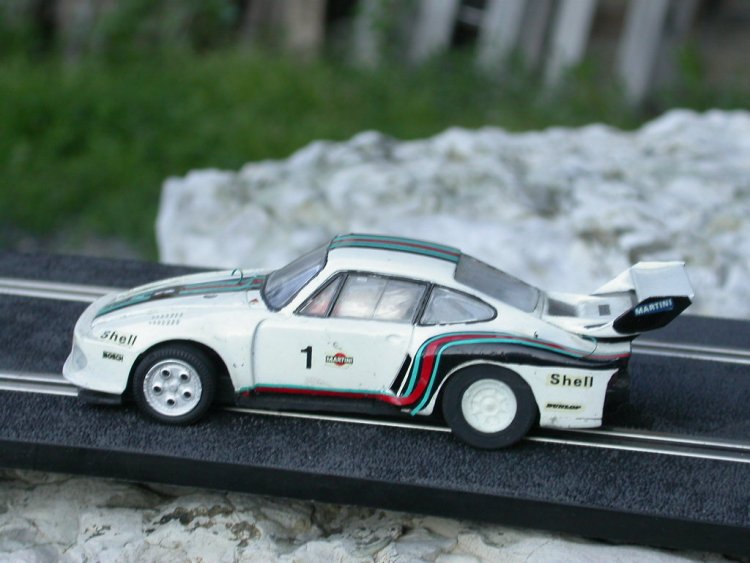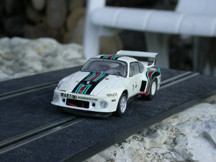dans sa livrée martini elle est superbe , je suis en train de refaire la mienne , car j'ai enfin trouver de quoi refaire les décals ,sur la première tentative la déco avait été faite à la main , je l'avait montée sur un chassis ninco avec un nc 2 , transmission slot it et jantes ar ninco pro race