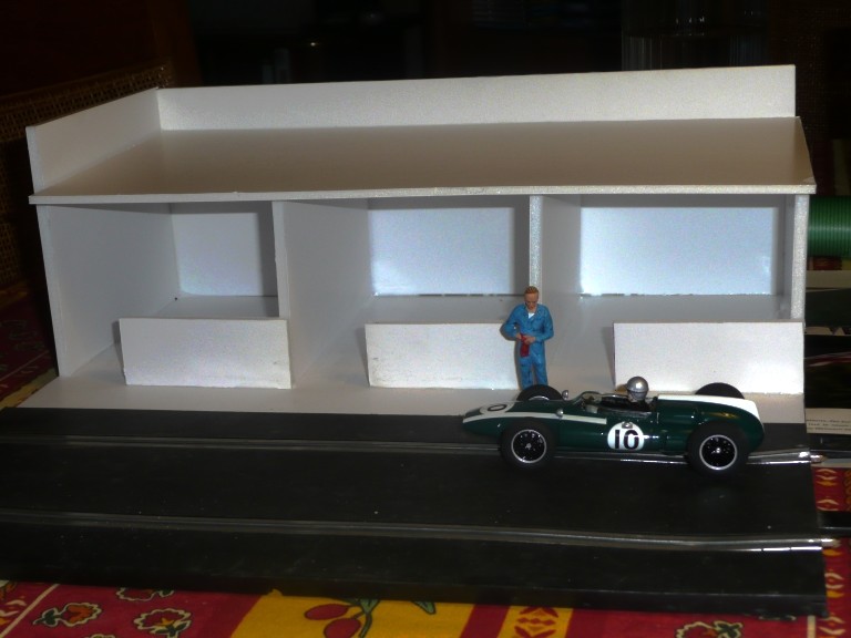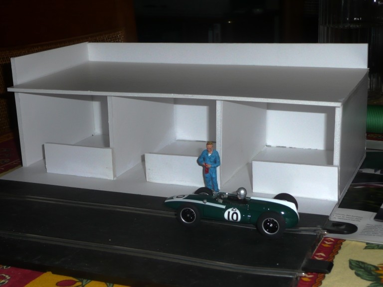), je me suis dit qu'il était temps. Avec tout ce que j'avais en tête, sans trop calculer ou tirer de plans, au feeling au fur et à mesure de la construction, je suis arrivé à un résultat qui me satisfait. Il manque encore le bandeau sur lequel prendront place les pubs et que je placerai au dessus du auvent, et sous celui-ci les numéros de stand. Un second bloc identique est prévu pour finir.