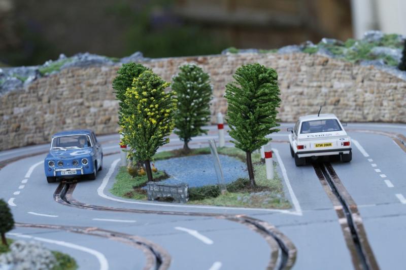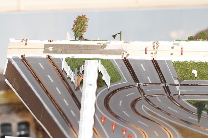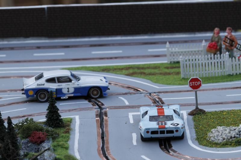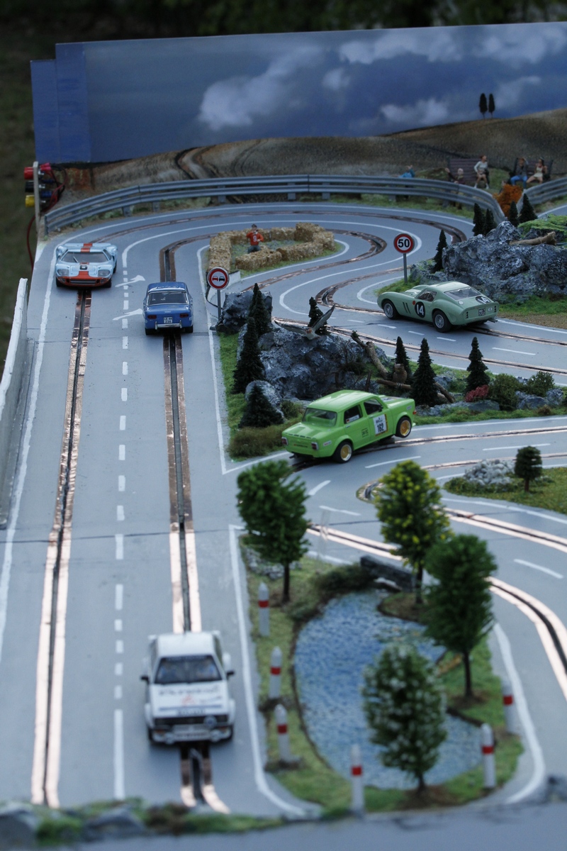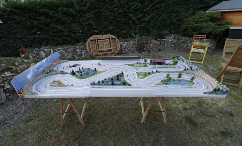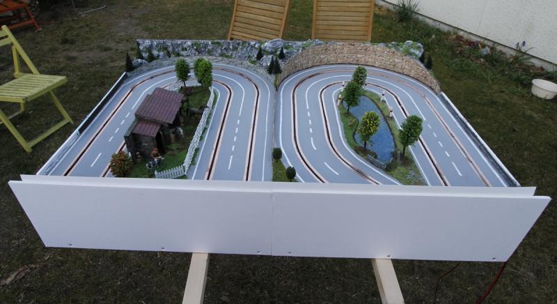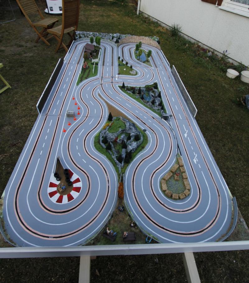 Tout ça m'encourage à continuer avec mon deuxième projet : après ma piste "rallye" en carton-plume, j'envisage un tracé "GT" du même métal, sur une plaque d'un seul morceau, à savoir 4" x 8" (1,22 m x 2,44 m). D'après mes calculs, j'arriverai également dans les 9 mètres de développé. Mais sans croisement