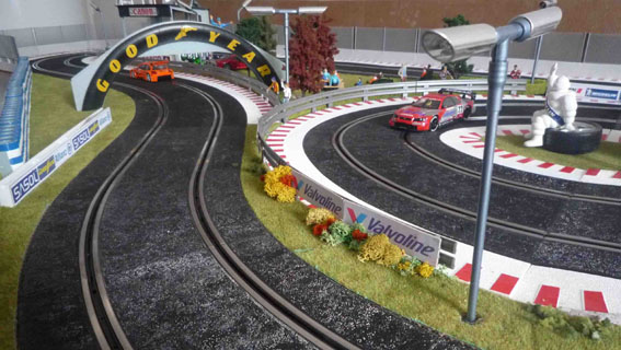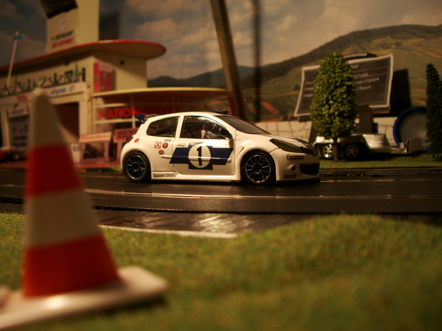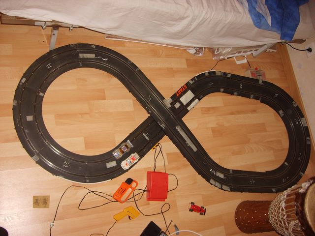 Ca m'a demandé pas mal de boulot pour récupérer les rails complètement oxydés (je ne parle même pas de toutes les traces de colle qu'il faut encore que je retire). En plus la plupart des clips permettant l'assemblage des rails sont cassés mais ça tient tant bien que mal avec quelques morceaux de scotch toilé par endroits. Ensuite les voitures avaient certains pneus tout secs mais heureusement j'en avais retrouvé d'autres avec le circuit et j'ai également retrouvé des tresses neuves. Ensuite les voitures partaient dans tous les sens et impossible de prendre un virage sans se sortir mais après un bon rodage de pneus sur du papier de verre, la tenue de route est maintenant tout à fait acceptable et franchement je m'amuse comme un fou ! Je pense que je ne vais pas en rester là car j'imagine que les circuits et les autos vendues aujourd'hui procurent des sensations encore meilleures que mon vieux circuit Jouef !!! C'est génial !!!!
